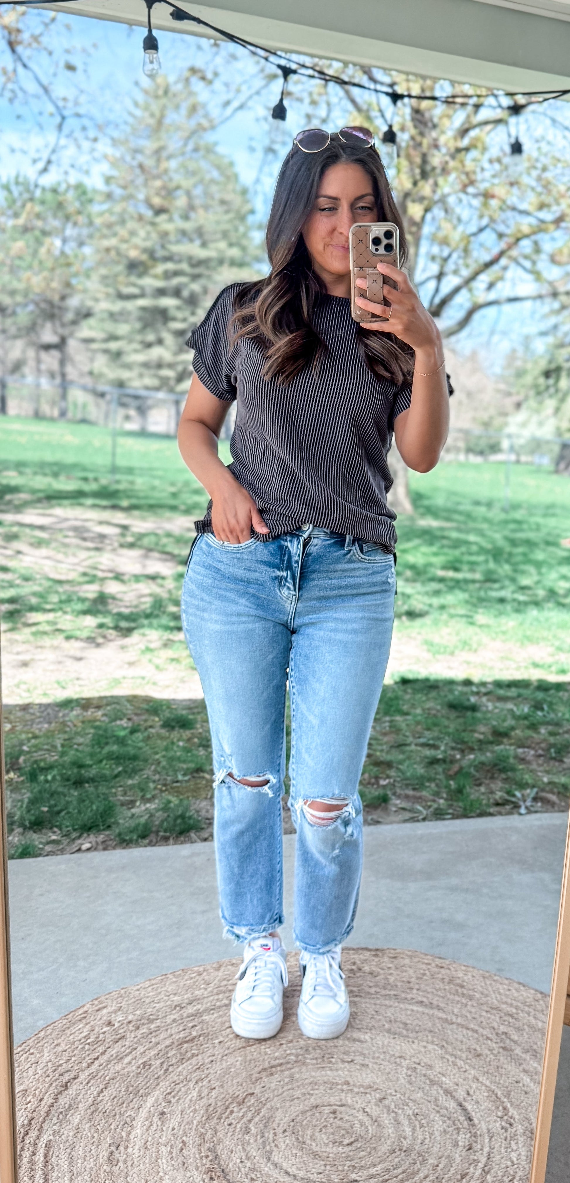 Our ribbed short sleeve top is soft, stretchy, and designed with subtle backstitch details for a unique finish. The flattering fit makes it easy to style with denim, shorts, skirts, or leggings for a polished yet casual look. Lightweight and versatile, it’s perfect on its own or layered under your favorite cardigan or jacket.