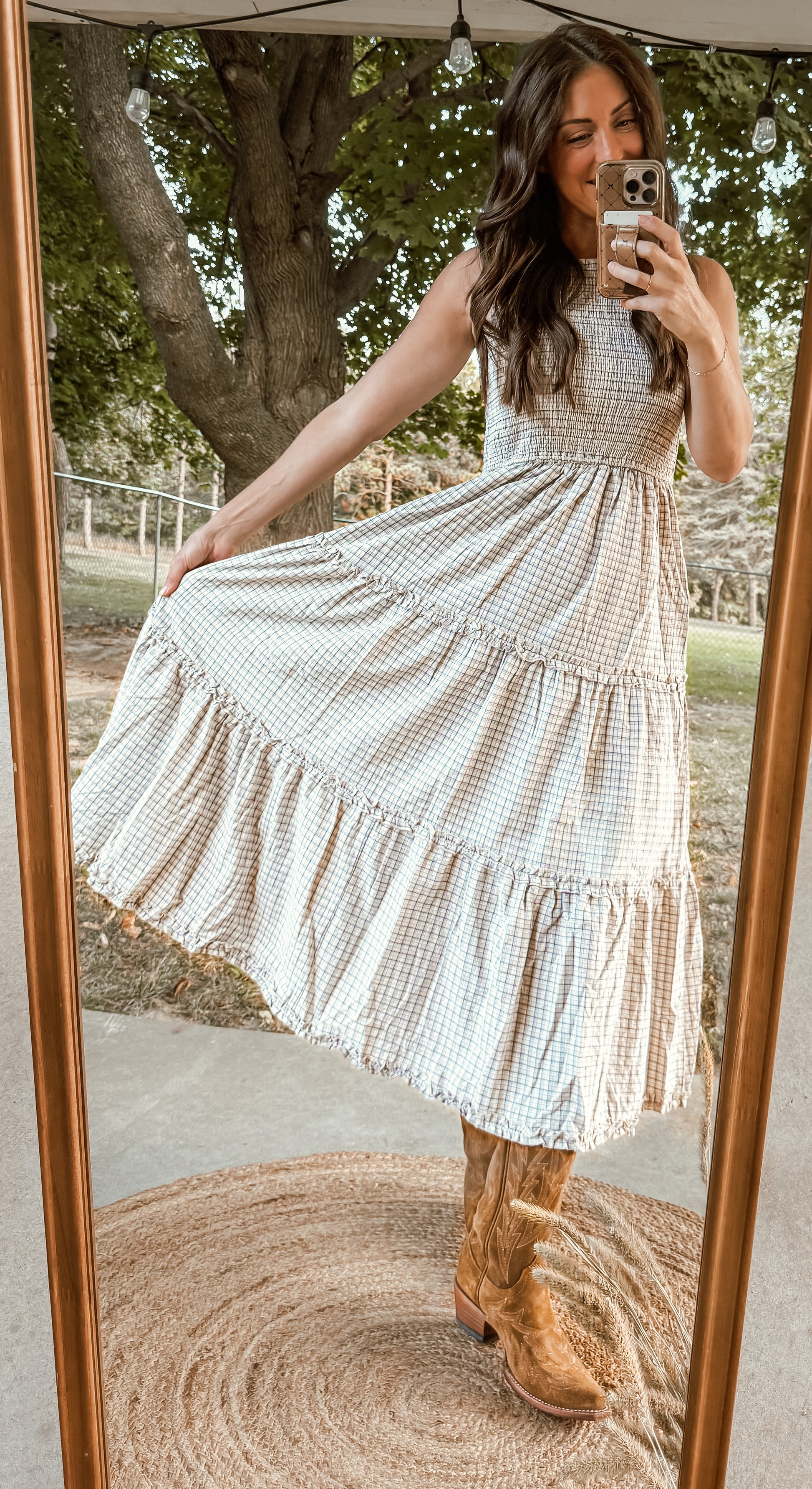 Step into effortless cottage charm with our Country Cottage Gingham Midi Dress. This tiered beauty was made for front-porch mornings, farmers market strolls, and Sunday afternoons that call for comfort and grace. Pair it with your favorite boots for a rustic look or dress it up with a cardigan for cozy fall layering.